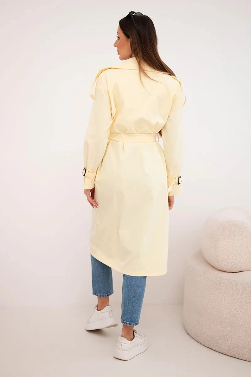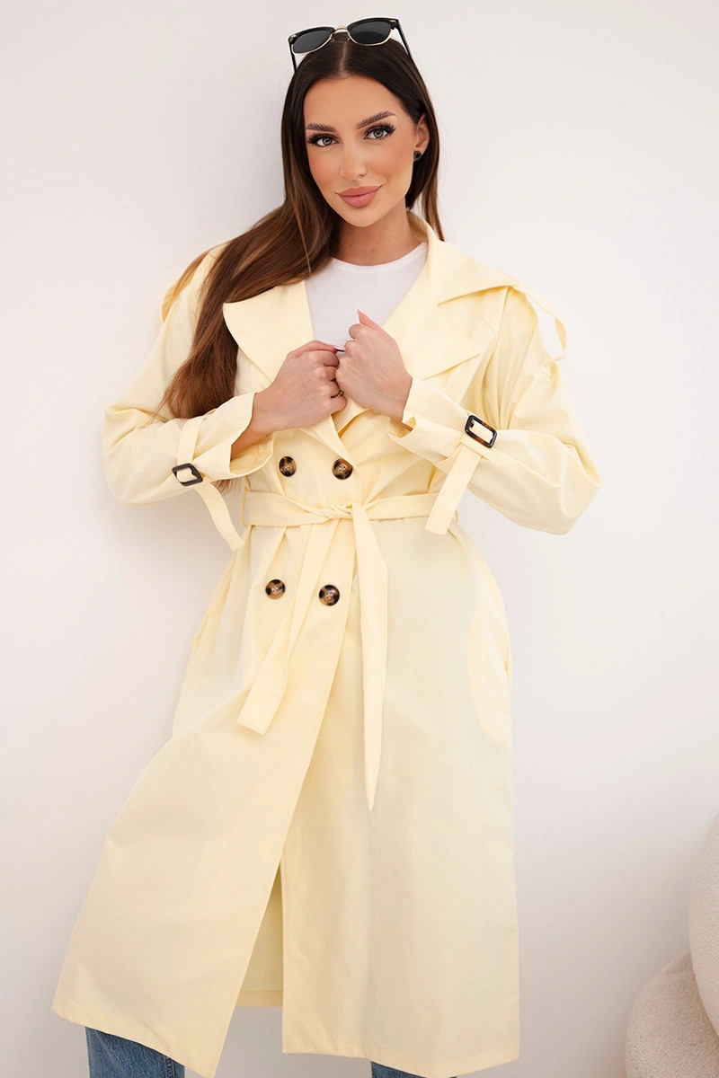 Stylový dámský kabát klasického střihu je nezbytným prvkem každého dámského šatníku. Model s efektním, širokým límcem, vázaným páskem v pase a dvojitým řadou knoflíků odkazuje na nadčasový styl trenčkotů. Délka nad kolena a zúžení v pase krásně podtrhují siluetu, přidávající celku eleganci. Rukávy s ozdobným manžetou a jemným nařasením na ramenou dodávají lehkost a ženský charakter.