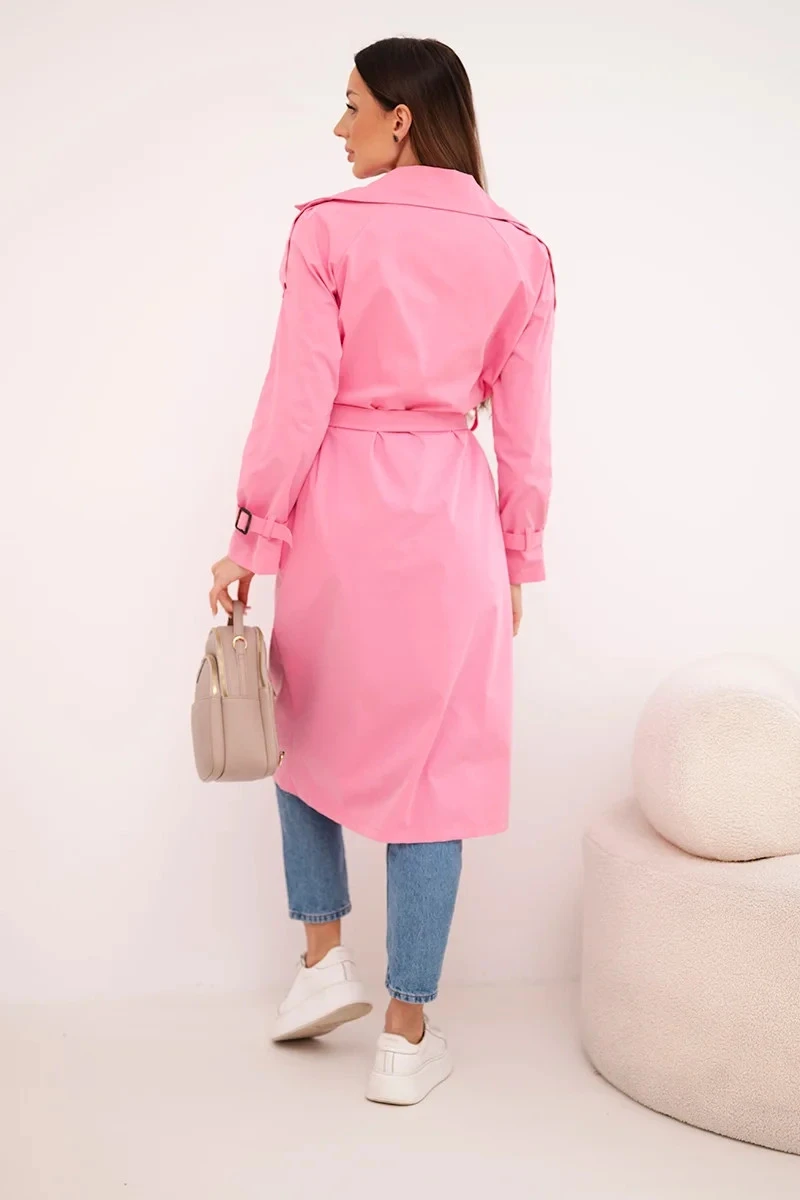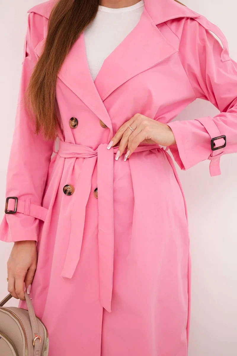 Stylový dámský kabát klasického střihu je nezbytným prvkem každého dámského šatníku. Model s efektním, širokým límcem, vázaným páskem v pase a dvojitým řadou knoflíků odkazuje na nadčasový styl trenčkotů. Délka nad kolena a zúžení v pase krásně podtrhují siluetu, přidávající celku eleganci. Rukávy s ozdobným manžetou a jemným nařasením na ramenou dodávají lehkost a ženský charakter.