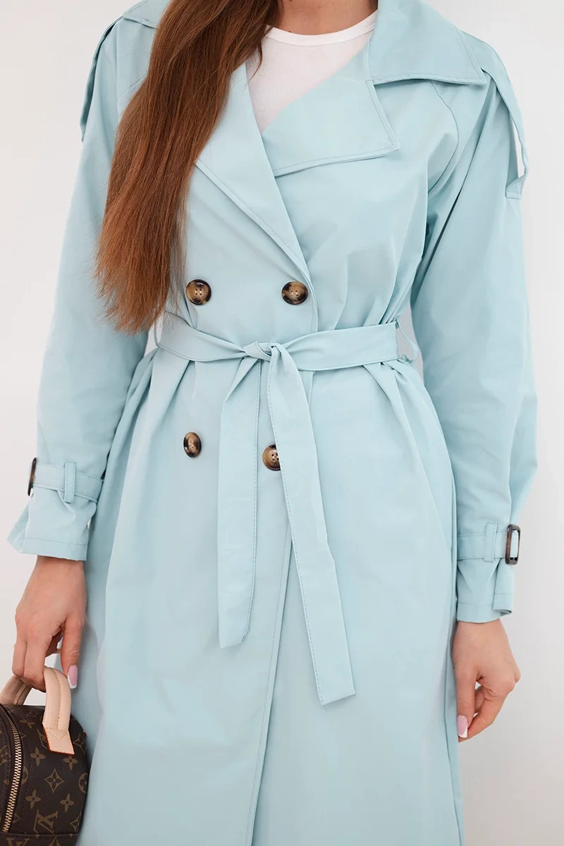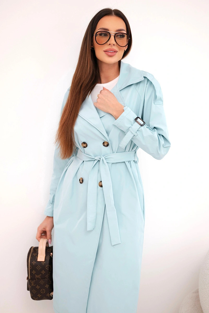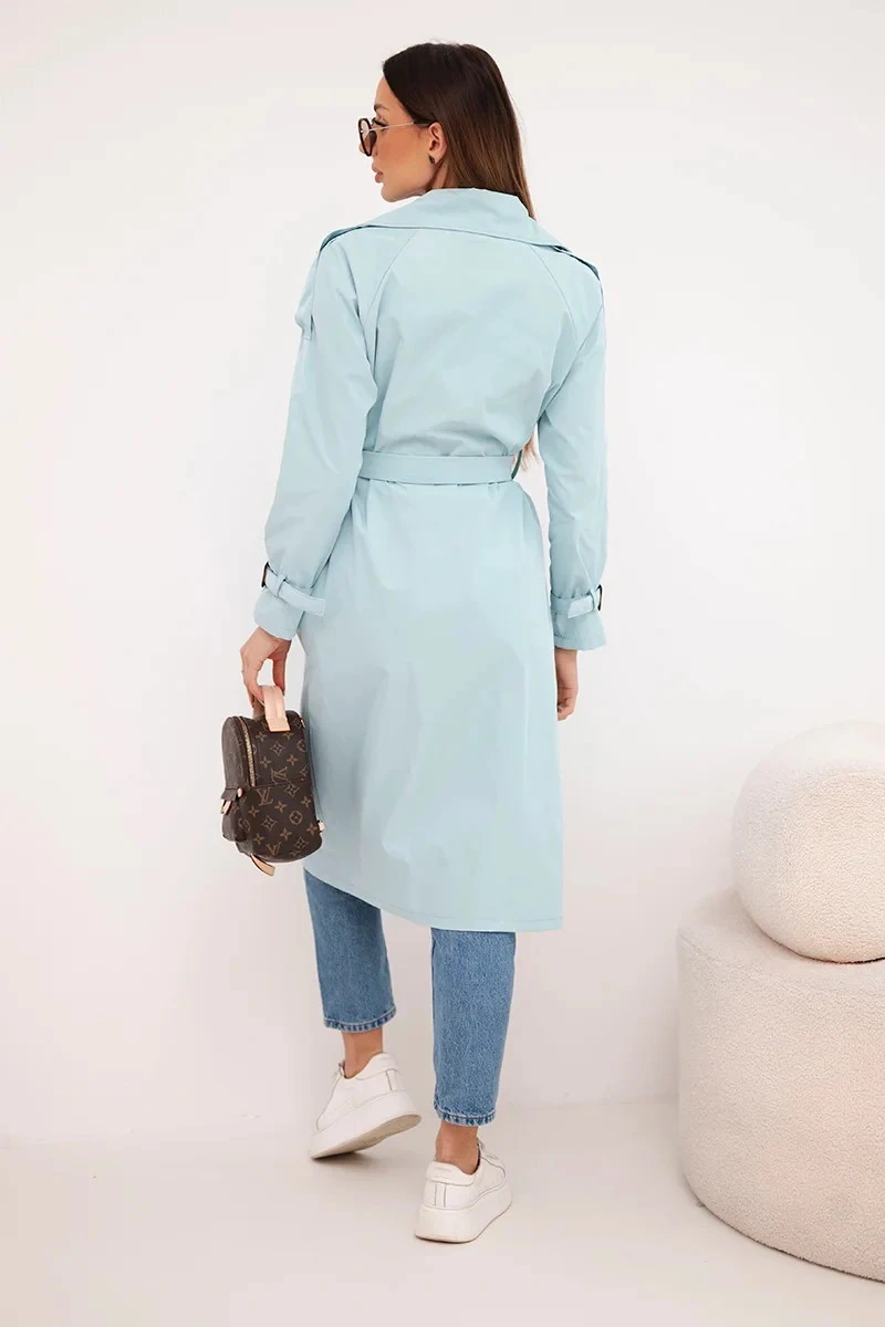 Stylový dámský kabát klasického střihu je nezbytným prvkem každého dámského šatníku. Model s efektním, širokým límcem, vázaným páskem v pase a dvojitým řadou knoflíků odkazuje na nadčasový styl trenčkotů. Délka nad kolena a zúžení v pase krásně podtrhují siluetu, přidávající celku eleganci. Rukávy s ozdobným manžetou a jemným nařasením na ramenou dodávají lehkost a ženský charakter.