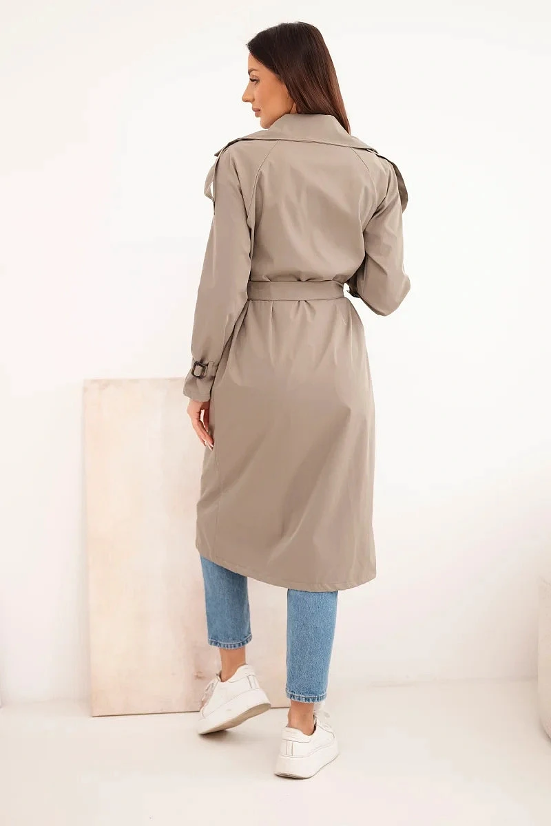 Stylový dámský kabát klasického střihu je nezbytným prvkem každého dámského šatníku. Model s efektním, širokým límcem, vázaným páskem v pase a dvojitým řadou knoflíků odkazuje na nadčasový styl trenčkotů. Délka nad kolena a zúžení v pase krásně podtrhují siluetu, přidávající celku eleganci. Rukávy s ozdobným manžetou a jemným nařasením na ramenou dodávají lehkost a ženský charakter.