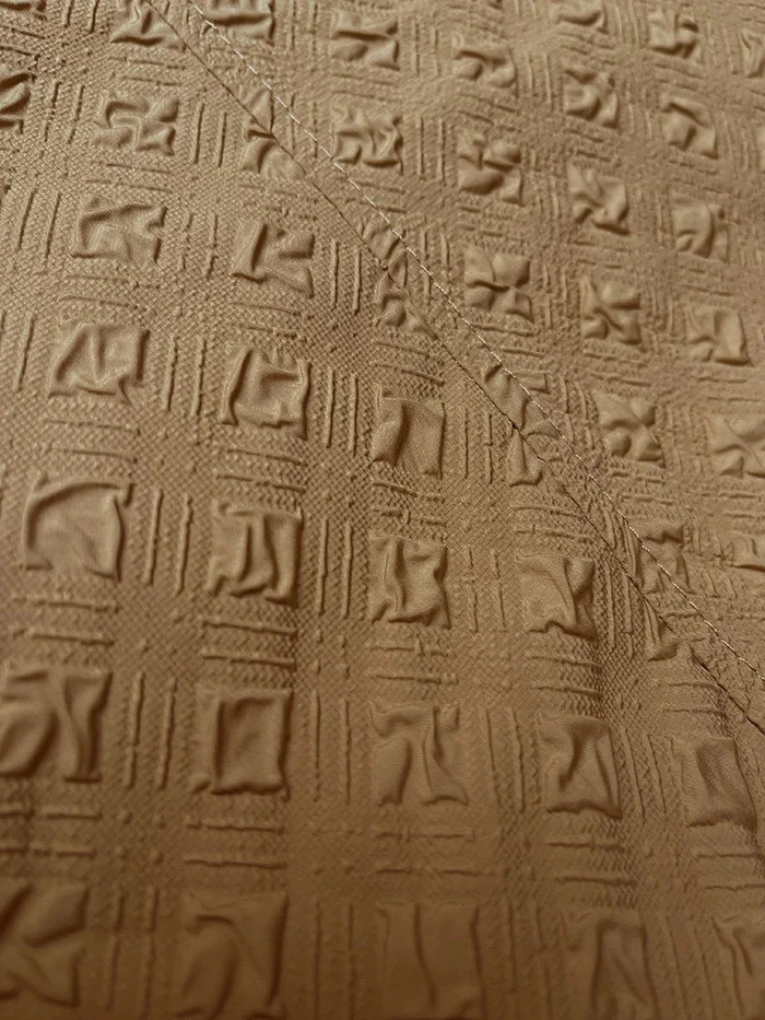 Jedna strana kabátu je prošívaná a druhá je strukturovaná. Kabát je zateplený syntetickou péřovou výplní, má pásek pro zavazování, dvě kapsy a zapíná se patentkami. Model má kapuci, kterou není možné odepnout. Kabát má délku do poloviny lýtek.
