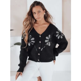 Sweter zapinany na guziki, ozdobiony aplikacjami w formie cekinowych kwiatów. Miękki materiał i luźniejszy krój zapewniają komfort, a dekoracyjne detale przyciągają uwagę. Idealny na sezon przejściowy, świetnie pasuje do jeansów i spódnic.