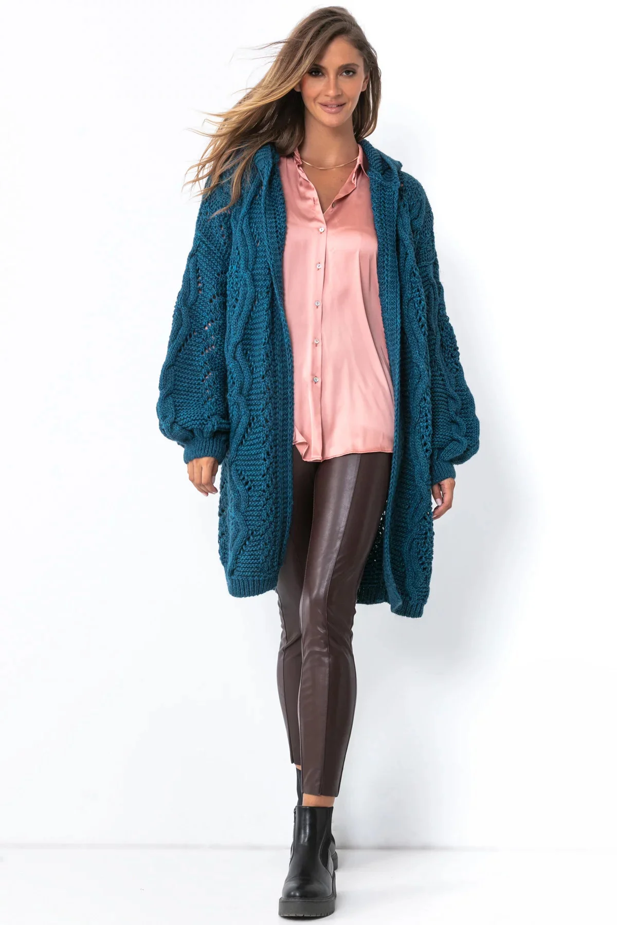 Hledáte nápad na módní letní oblečení, když je počasí spíše podzimní? Dlouhé, zajímavě zakončené svetry zaujímají ve vašem šatníku zvláštní místo?Podívejte se na náš svetr s dlouhými rukávy a kapucí s krásnou prolamovanou vazbou. Je to pohodlný svetr, který pěkně sedí na těle. Tento střih svetru se hodí k maxi šatům a letním kalhotám. Na podzim a v zimě ji noste přes halenky s dlouhými rukávy a roláky. Svetr má kapuci, která mu dodává sportovní charakter. Proto se skvěle hodí i k džínám a vhodným kalhotám. Vytvořte si jedinečné soupravy s teniskami, oxfordkami, kotníkovými botami a botami nad kolena. Dlouhý a pohodlný kardigan v jednom z pěti módních odstínů je nezbytnou součástí vašeho podzimního/zimního šatníku.