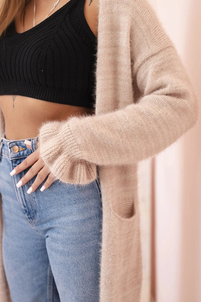 Stylový a útulný dámský kardigan z mohairu, ideální na chladnější dny. Vyrobený z kombinace mohairu, vlny a akrylu, zajišťuje vynikající termální vlastnosti, a zároveň lehkost a měkkost na dotek. Model s dlouhým rukávem, otevřeným předním dílem a praktickými kapsami. Dlouhý střih opticky zeštíhluje postavu a skvěle se hodí jak k kalhotám, tak k šatům.