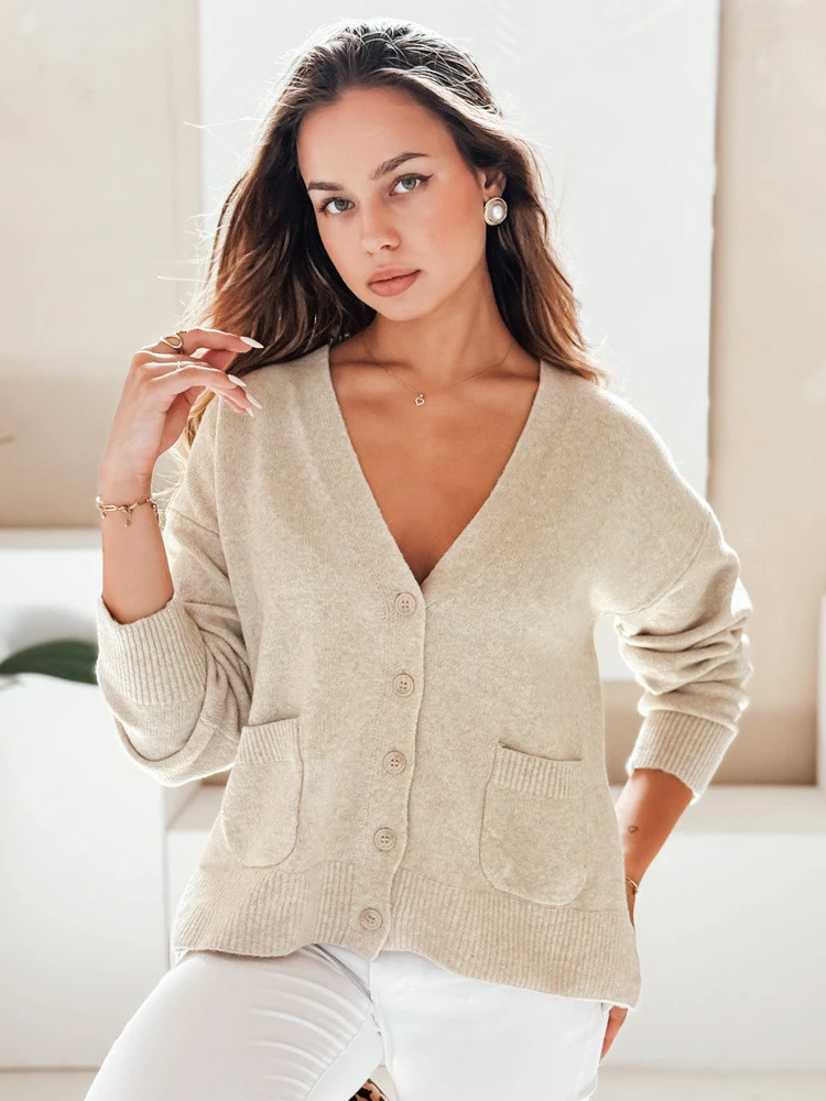 Klasický kardigan volnějšího střihu, ideální pro chladnější dny a všestranně stylizovaný, model SORELIE kombinuje pohodlí pleteniny s praktickými detaily, jako jsou kapsy a špičatý výstřih, a hodí se jak k ležérním, tak k rafinovanějším outfitům.