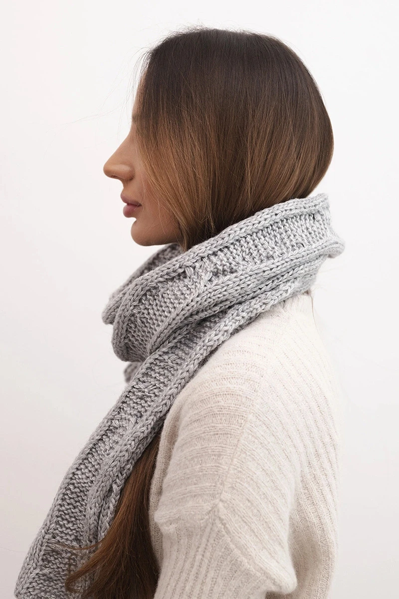 Stylový, teplý dámský šál vyrobený z měkké a příjemné příze s příměsí přírodní vlny. Klasický copánkový vzor mu dodává elegantní charakter, který se hodí jak pro každodenní, tak i pro formálnější stylizace.