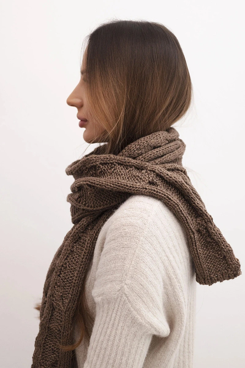 Stylový, teplý dámský šál vyrobený z měkké a příjemné příze s příměsí přírodní vlny. Klasický copánkový vzor mu dodává elegantní charakter, který se hodí jak pro každodenní, tak i pro formálnější stylizace.