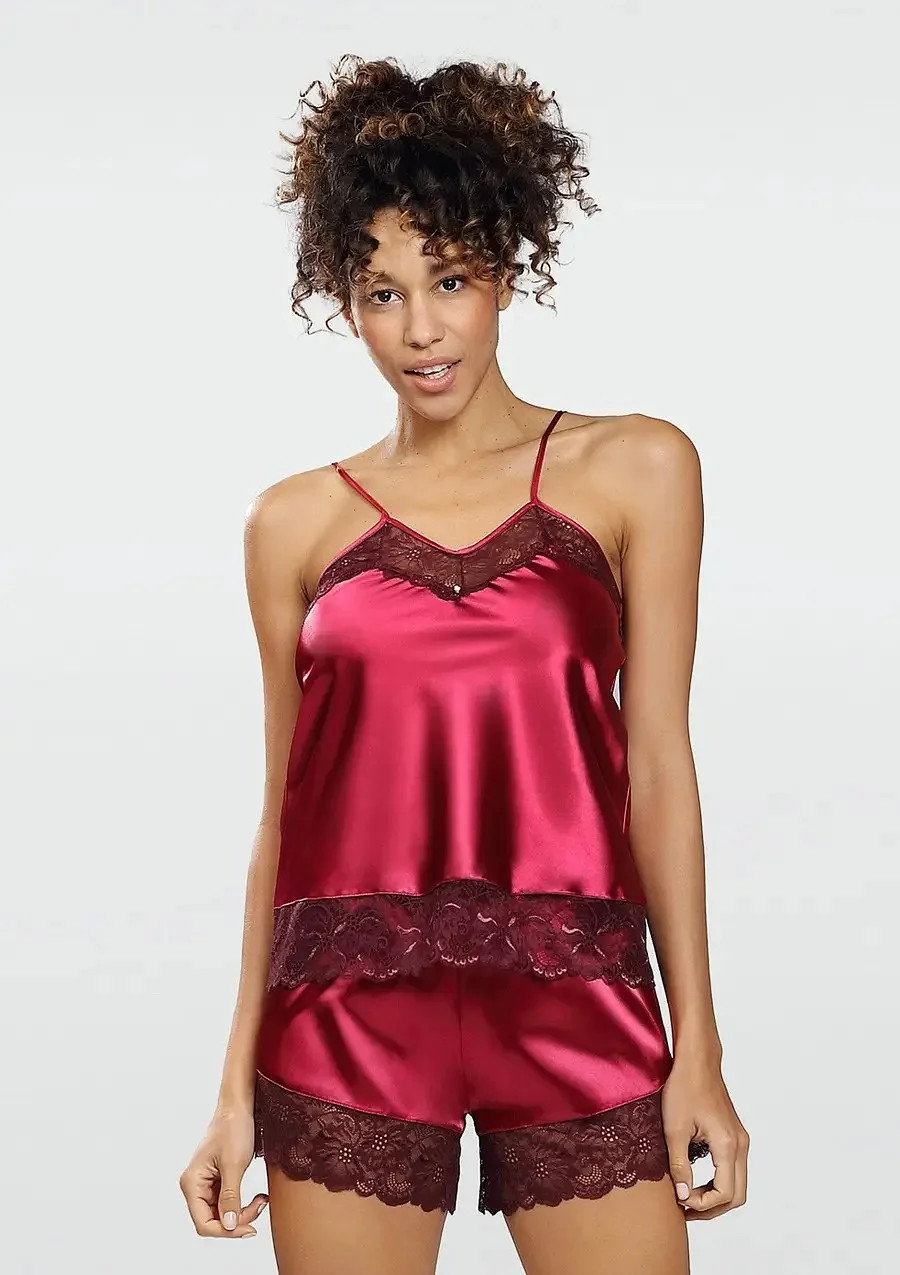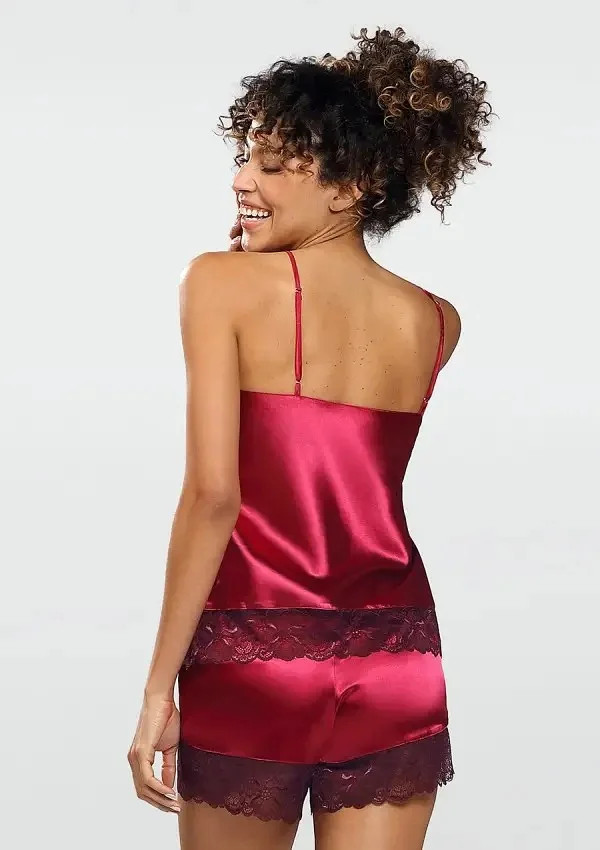 Košilka pyžama má úzká ramínka, jejichž délku je možné nastavit. Výstřih zdobí efektní krajka s květinovým motivem. Krátké kalhoty mají volný střih. Nohavice jsou olemovné krajkou.