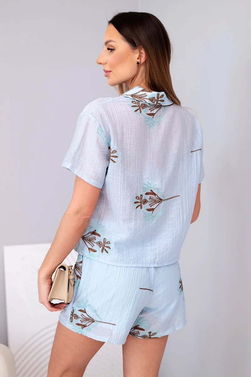 Módní dámský komplet je ideální volbou pro ženy, které mají rády stylové a pohodlné soupravy na teplejší dny. Souprava se skládá z košile s krátkým rukávem a sukně-šortek, které spojují elegantní vzhled sukně s pohodlím nošení kraťasů. Celek je ozdoben efektním vyšívaným rostlinným vzorem, který dodává outfitu výjimečný a ženský charakter.