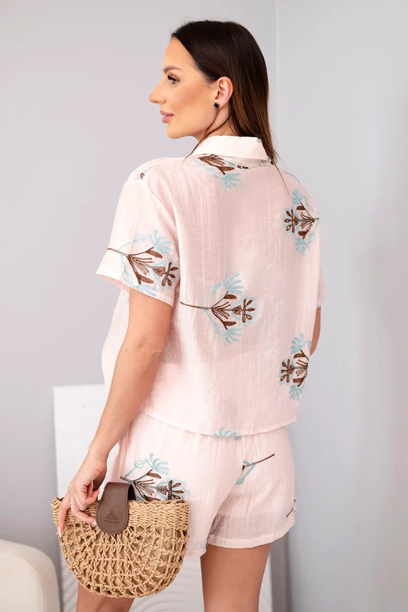 Dámský komplet košile s krátkým rukávem a šortky pudrově růžová model 22048789 - K-Fashion