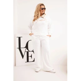 Stylový a nesmírně pohodlný dámský sportovní komplet plus size je ideální nabídkou pro ženy, které si cení pohodlí a módního vzhledu. Sada se skládá z mikiny s efektním límcem a nápisem na přední straně, a také kalhot s širokými nohavicemi a elastickým pasem se šňůrkou na úpravu.