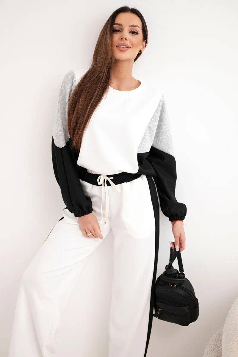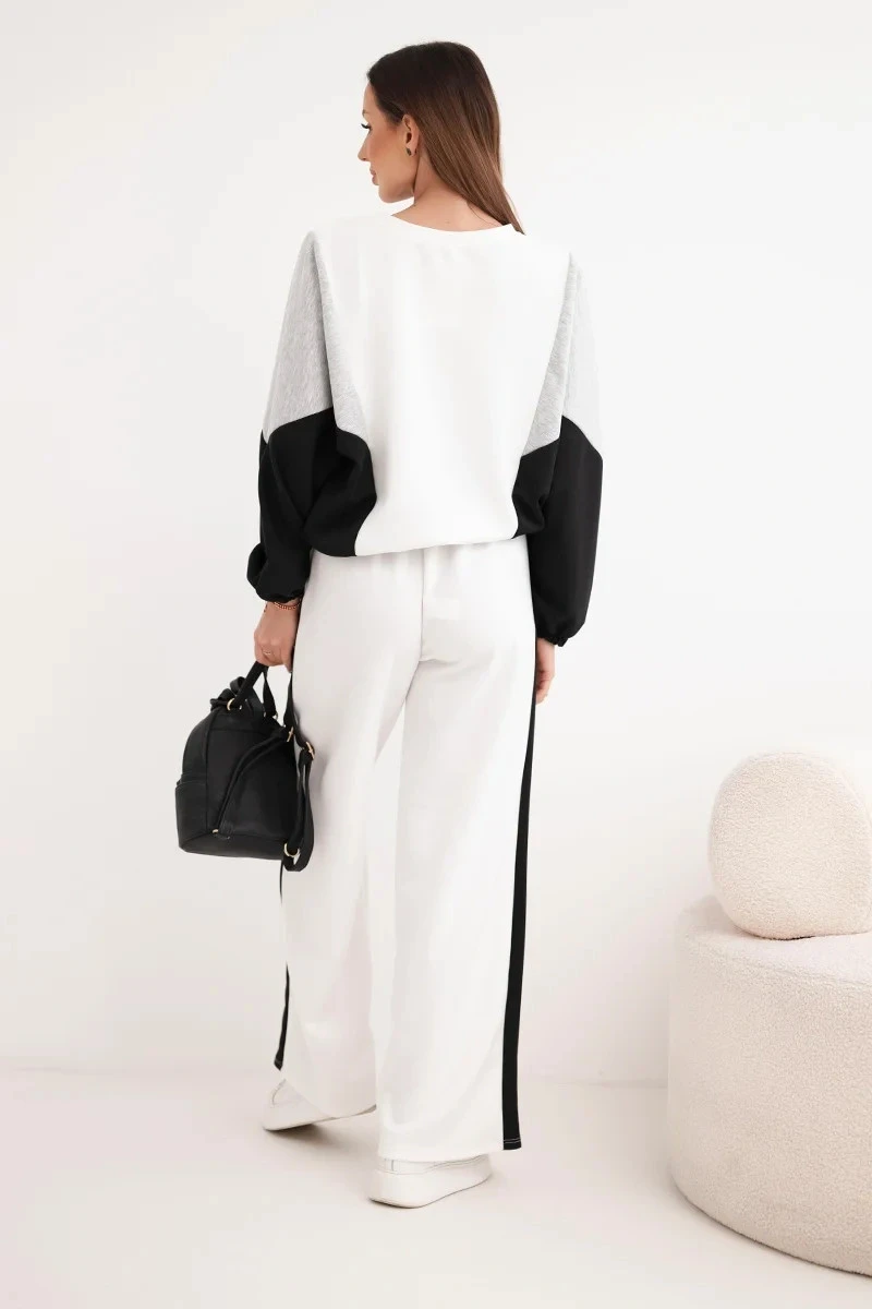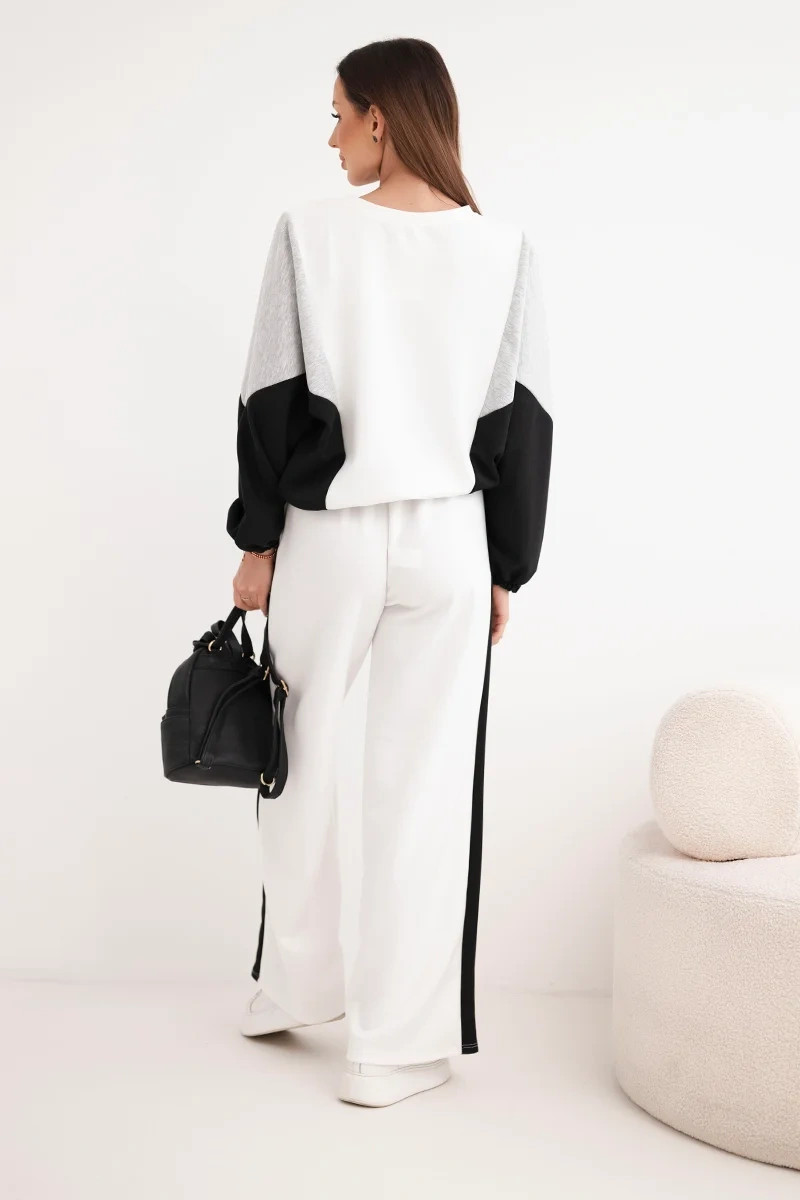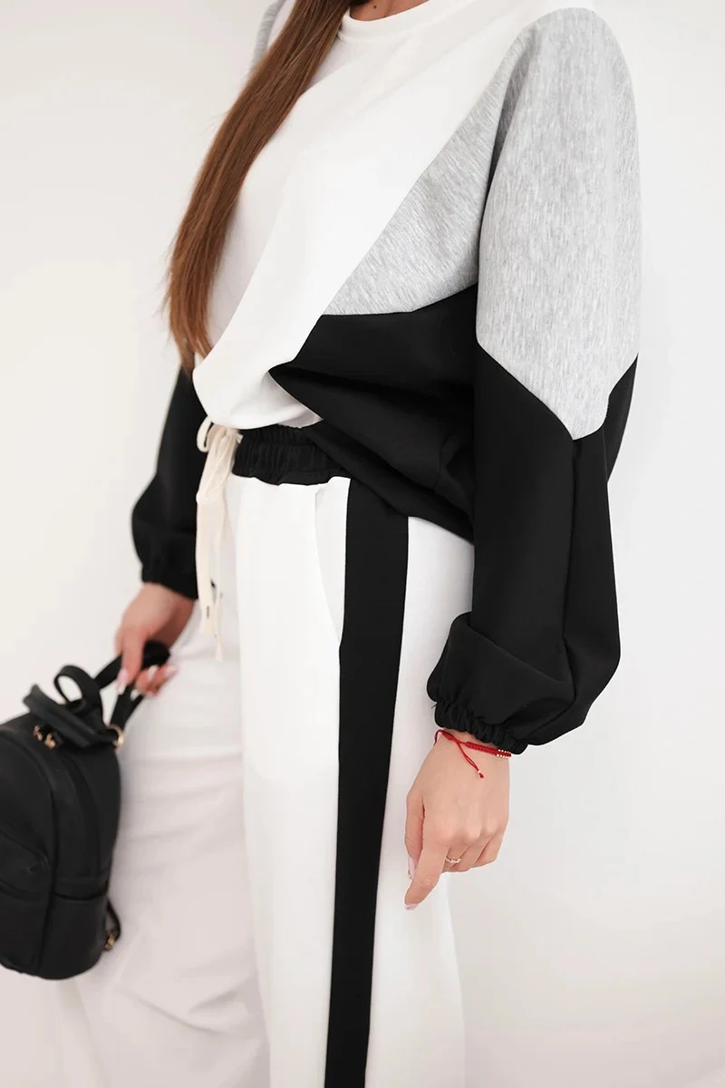 Mikina volného střihu s nízkou linií ramen a elastickými manžetami na rukávech zajišťuje volnost pohybu a výjimečné pohodlí. Kontrastní vsadky jí dodávají módní, moderní charakter. Kalhoty s elastickým pasem a širokým střihem garantují komfort po celý den a jejich minimalistický střih krásně zdůrazňuje siluetu.