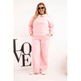Stylový a nesmírně pohodlný dámský sportovní komplet plus size je ideální nabídkou pro ženy, které si cení pohodlí a módního vzhledu. Sada se skládá z mikiny s efektním límcem a nápisem na přední straně, a také kalhot s širokými nohavicemi a elastickým pasem se šňůrkou na úpravu.