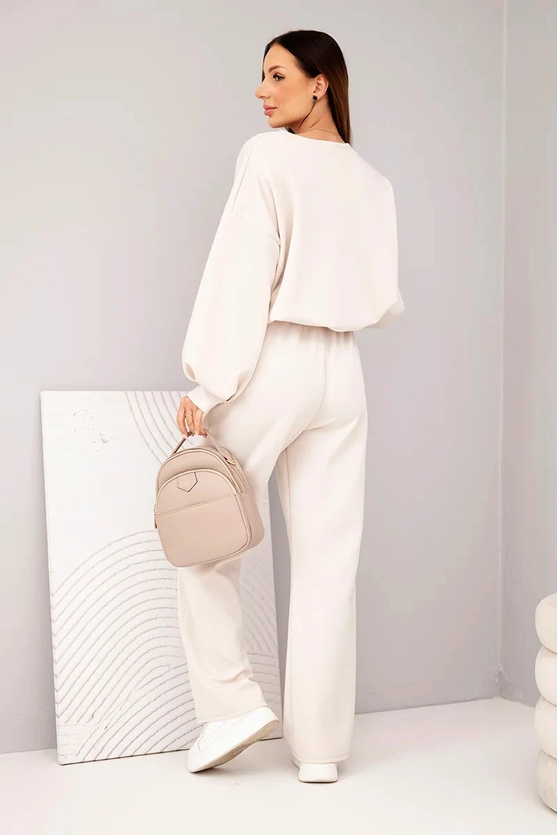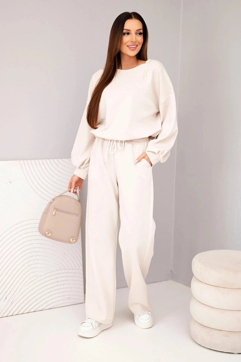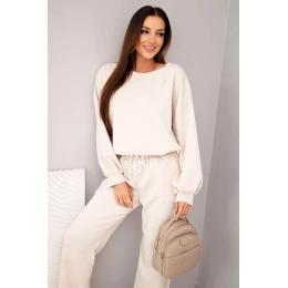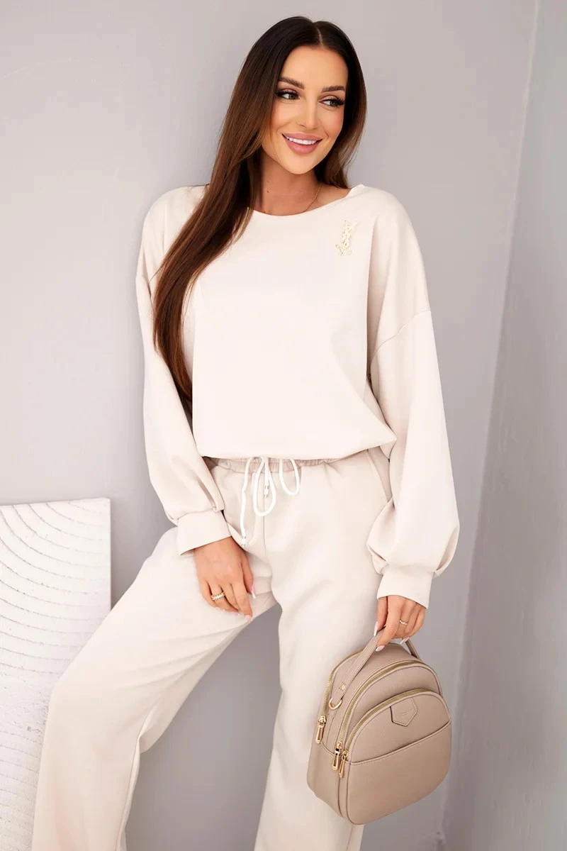 Dámský komplet máslová mikina s broží a kalhoty s rovnou nohavicí béžový