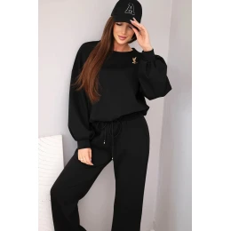 Dámský komplet máslová mikina s broží a kalhoty s rovnými nohavicemi černý