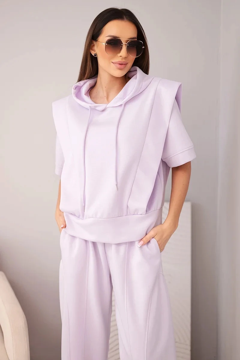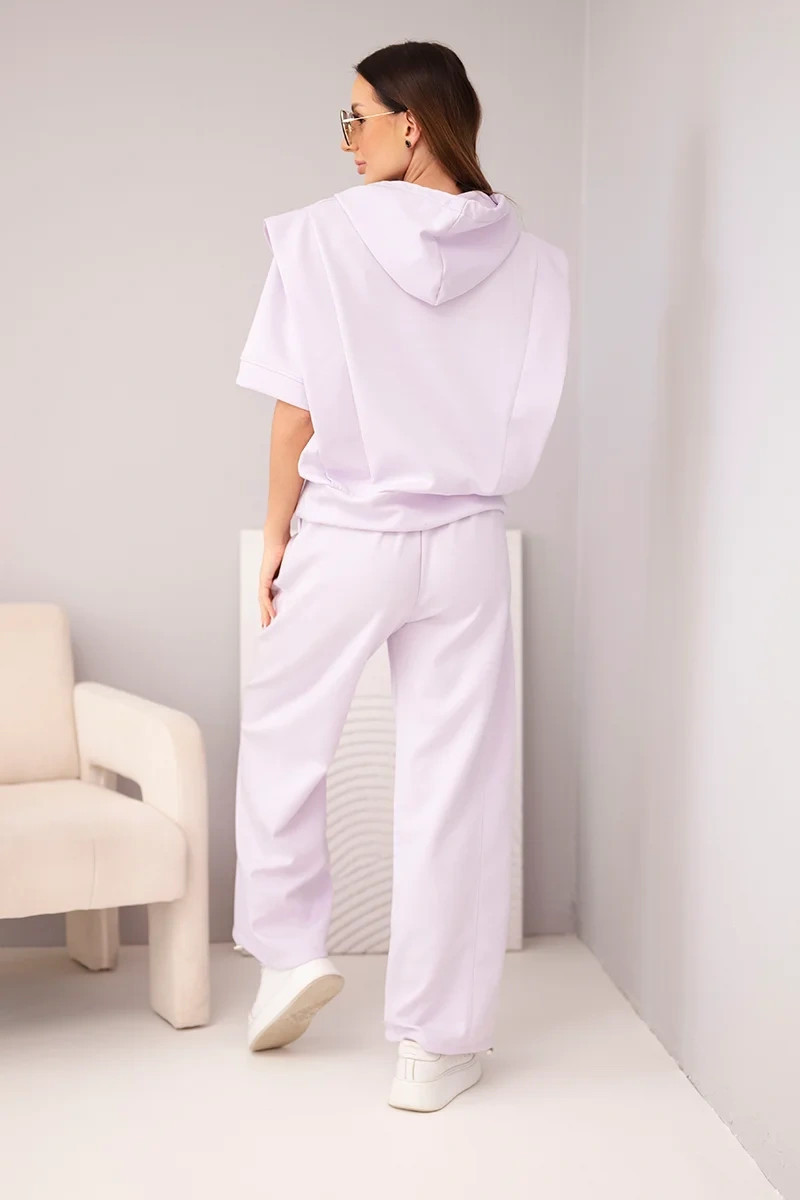 Dámský komplet máslový, mikina s kapucí a volné kalhoty se zavazováním světle fialová