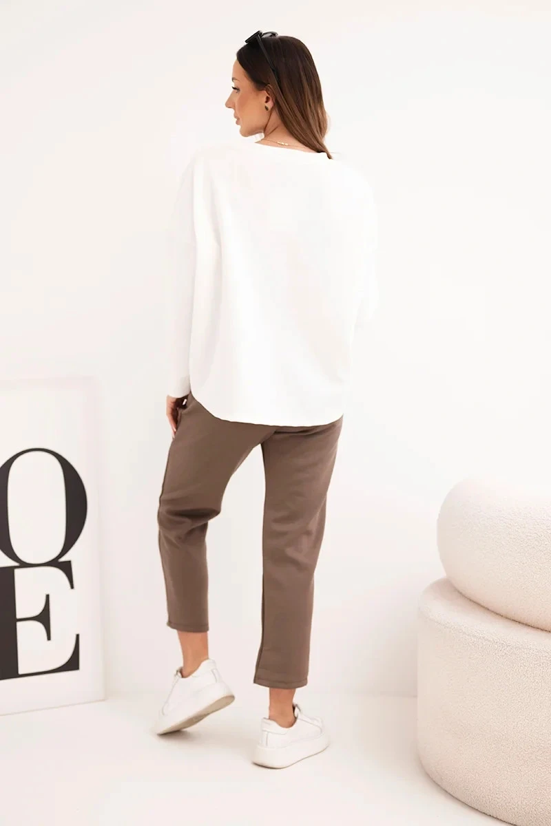 Střih: mikina volného střihu s nižší linií ramene, kalhoty s gumou a tkaničkami