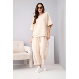 Mikina volného střihu má rukávy s ozdobnými lampasy, které celku dodávají moderní charakter. Kalhoty s elastickým pasem a bočními lampasy opticky zeštíhlují nohy. Komplet se skvěle hodí na běžné nošení, na procházku, nákupy nebo na cesty.