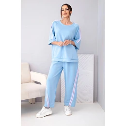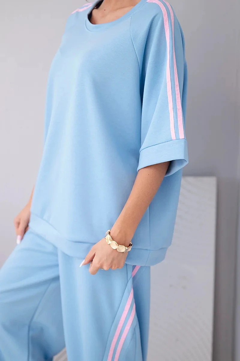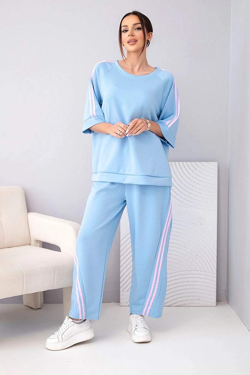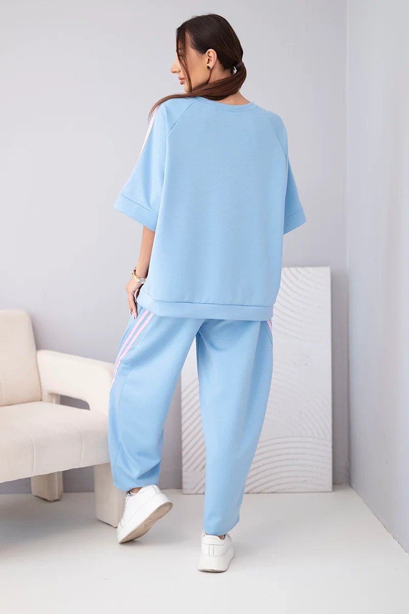 Mikina volného střihu má rukávy s ozdobnými lampasy, které celku dodávají moderní charakter. Kalhoty s elastickým pasem a bočními lampasy opticky zeštíhlují nohy. Komplet se skvěle hodí na běžné nošení, na procházku, nákupy nebo na cesty.