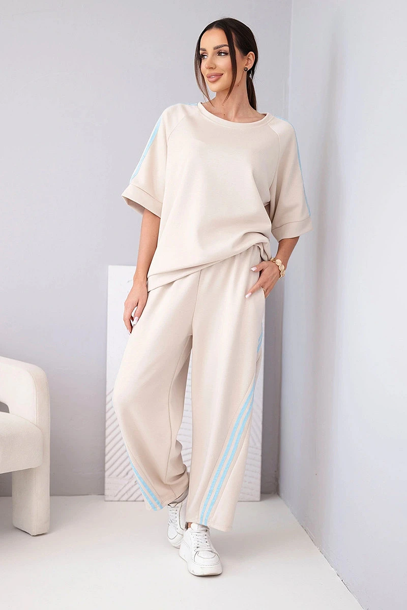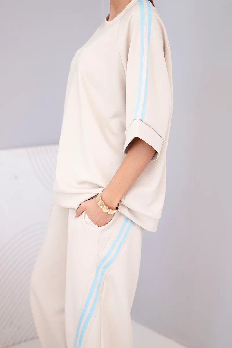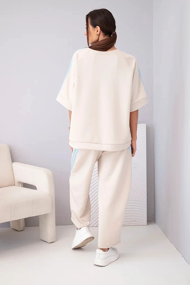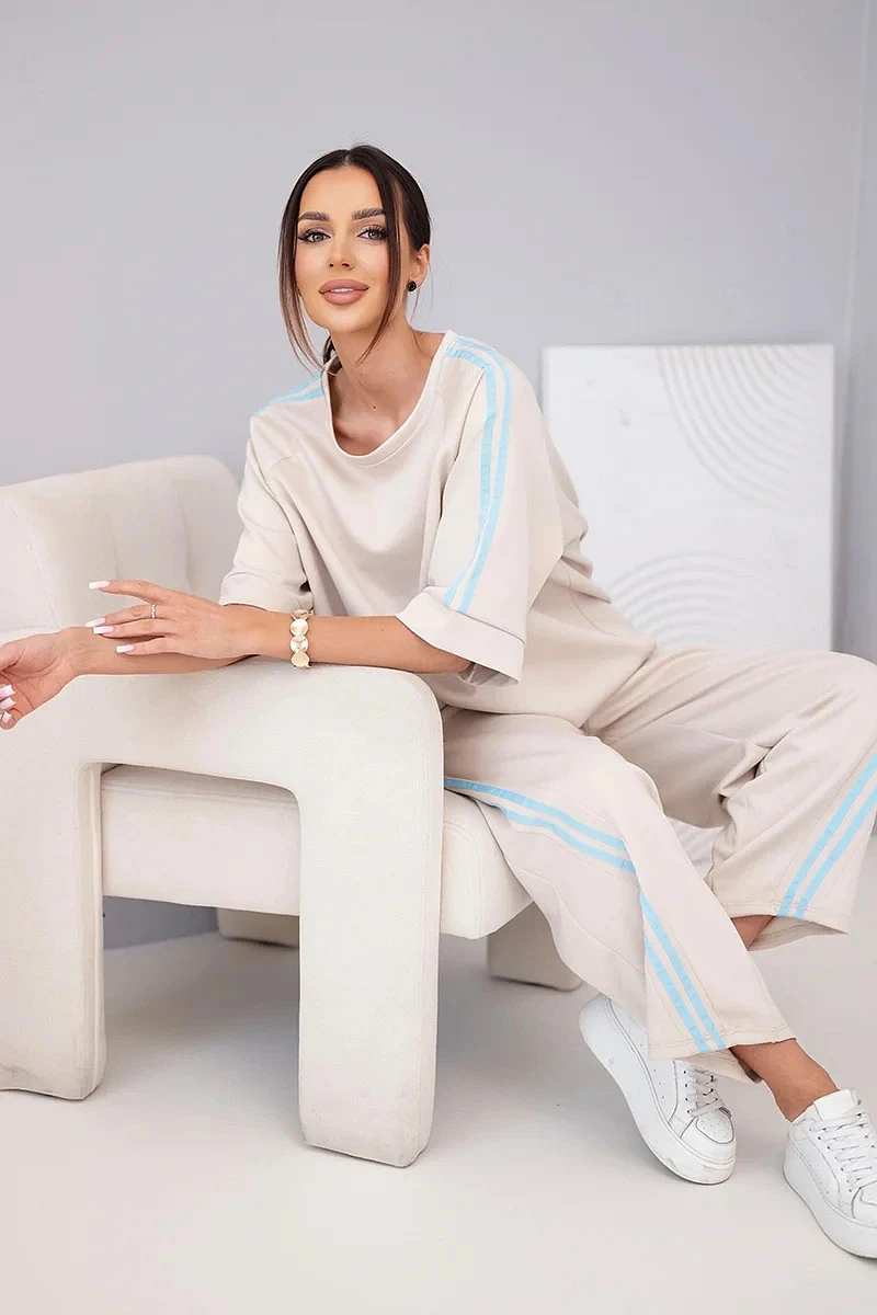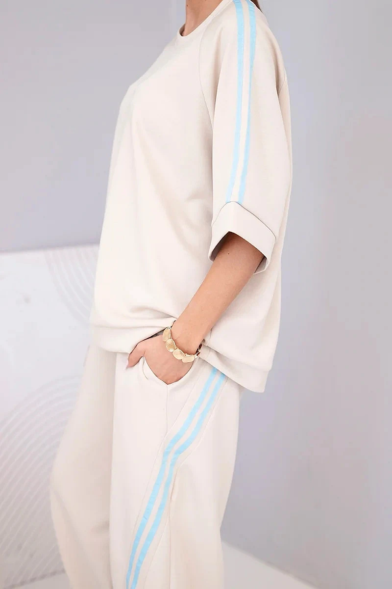 Mikina volného střihu má rukávy s ozdobnými lampasy, které celku dodávají moderní charakter. Kalhoty s elastickým pasem a bočními lampasy opticky zeštíhlují nohy. Komplet se skvěle hodí na běžné nošení, na procházku, nákupy nebo na cesty.