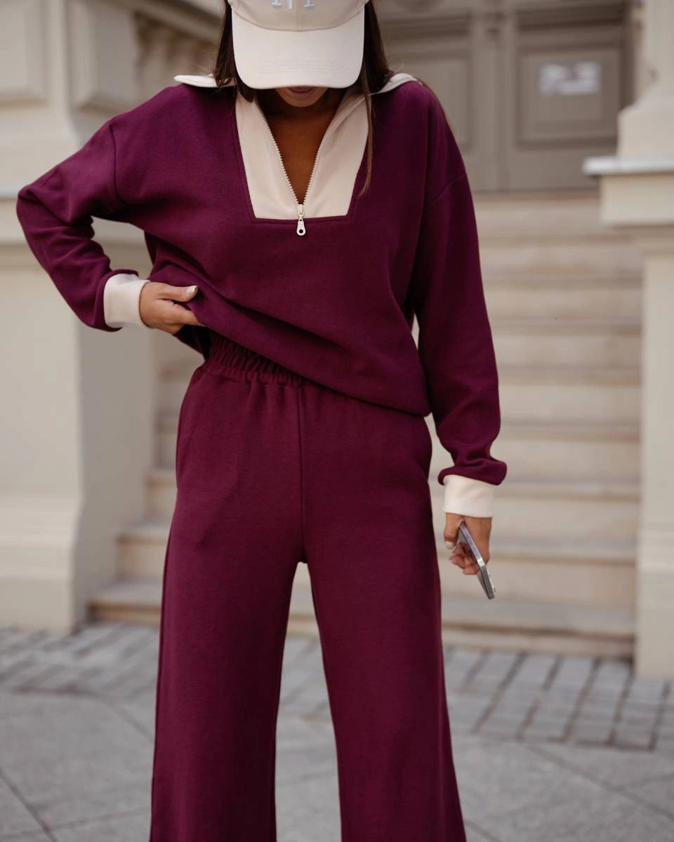 Dámský komplet mikina se stojáčkem a široké kalhoty s kapsami ve vínové bordó barvě model 21470467 - Moon