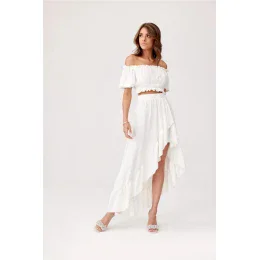 Asymetrický komplet halenky a sukně je vyroben z měkké a příjemné látky, která poskytne pohodlí i těm nejnáročnějším ženám. Souprava se skládá z krátkého topu a asymetrické sukně. Top má krásná odhalená ramena a volánky v pase a ve výstřihu. Sukně zase zaujme nádherným asymetrickým střihem, volánky v přední části a pružným pasem, který se přizpůsobí každé postavě. Letní komplet bude dokonale slušet každému typu krásy, protože je k dispozici ve velké škále barev. Výrobek je vyroben a ušit v Polsku.