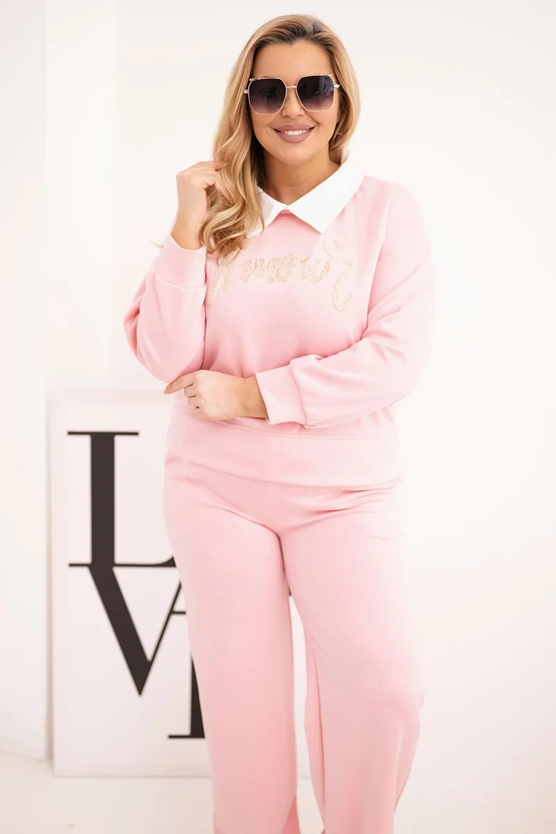 Dámský komplet model 21924582 Plus Size se širokými nohavicemi a límečkem světle růžový - K-Fashion