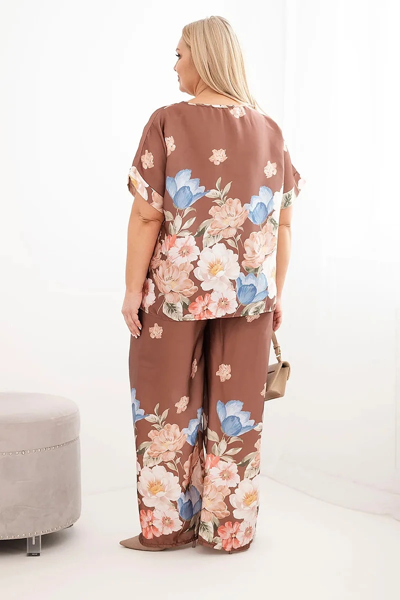 Dámský komplet Plus Size s halenkou a kalhotami s květinovým vzorem a širokou nohavicí hnědý