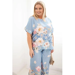 Dámský komplet Plus Size s halenkou a kalhotami s květinovým vzorem a širokými nohavicemi modrý