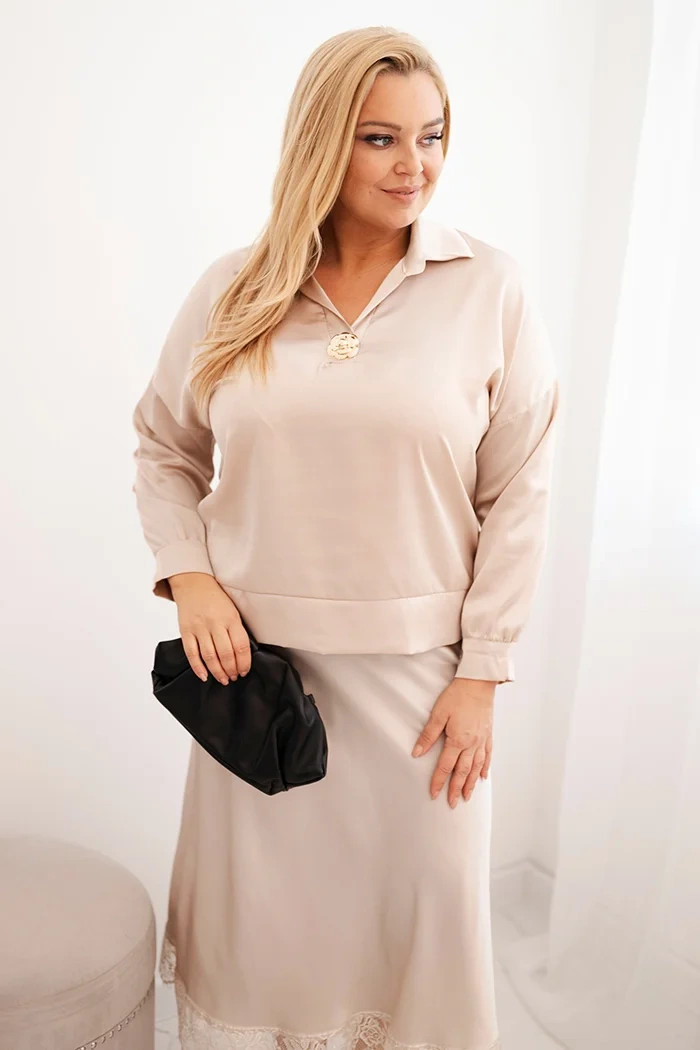 Dámský komplet Plus Size se saténovým leskem a krajkou béžový