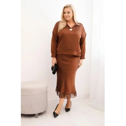 Dámský komplet Plus Size se saténovým leskem a krajkou camelový