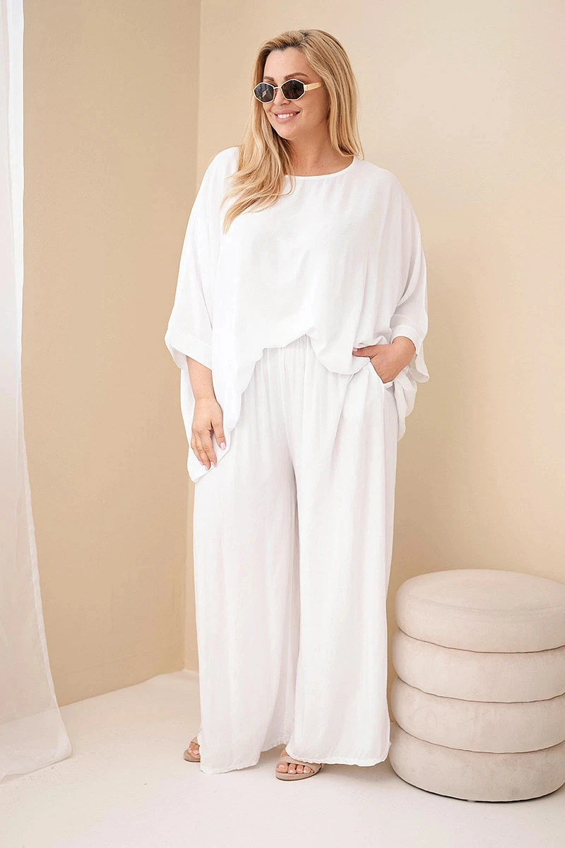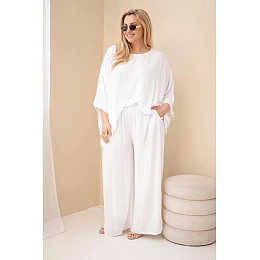 Dámský komplet Plus Size z viskózy se širokými kalhotami a halenkou bílý