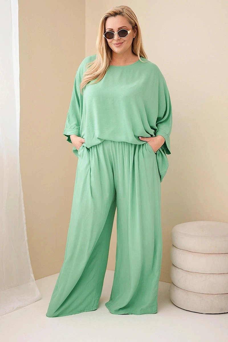 Dámský komplet Plus Size z viskózy se širokými kalhotami a halenkou zelený
