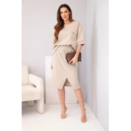 Stylový dámský máslový komplet je ideální volbou pro ženy, které si cení pohodlí a módního vzhledu v jednom. Souprava se skládá z volného topu s krátkým rukávem a přiléhavé midi sukně s elastickým pasem. Hladký materiál s příjemnou, měkkou strukturou se krásně přizpůsobí postavě a zajišťuje pohodlí po celý den. Ozdobná kapsa typu cargo na topu i sukni dodává celku moderní charakter a zavazování v pase zvýrazňuje ženskou siluetu.