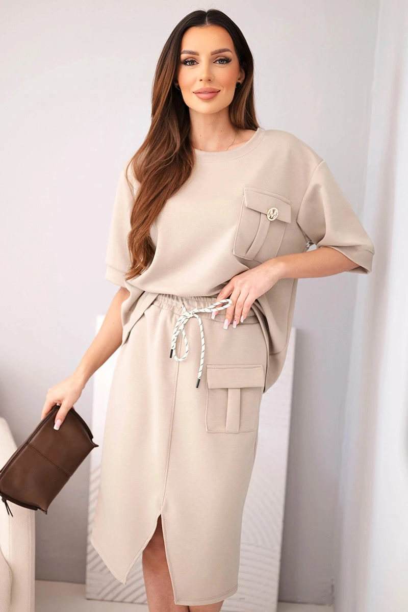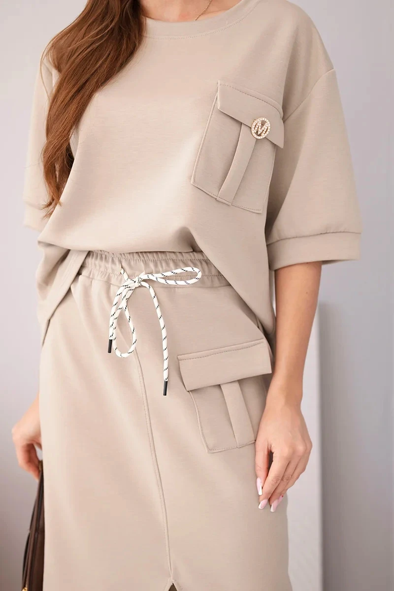 Stylový dámský máslový komplet je ideální volbou pro ženy, které si cení pohodlí a módního vzhledu v jednom. Souprava se skládá z volného topu s krátkým rukávem a přiléhavé midi sukně s elastickým pasem. Hladký materiál s příjemnou, měkkou strukturou se krásně přizpůsobí postavě a zajišťuje pohodlí po celý den. Ozdobná kapsa typu cargo na topu i sukni dodává celku moderní charakter a zavazování v pase zvýrazňuje ženskou siluetu.