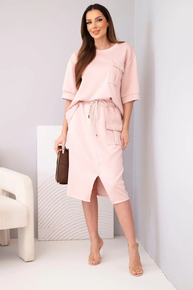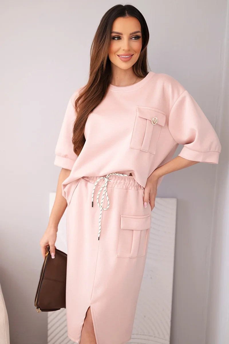 Stylový dámský máslový komplet je ideální volbou pro ženy, které si cení pohodlí a módního vzhledu v jednom. Souprava se skládá z volného topu s krátkým rukávem a přiléhavé midi sukně s elastickým pasem. Hladký materiál s příjemnou, měkkou strukturou se krásně přizpůsobí postavě a zajišťuje pohodlí po celý den. Ozdobná kapsa typu cargo na topu i sukni dodává celku moderní charakter a zavazování v pase zvýrazňuje ženskou siluetu.