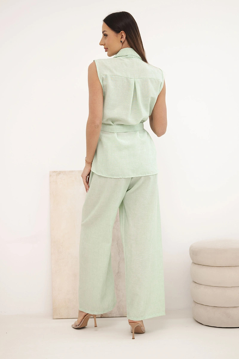 Stylový dámský komplet je vynikající nabídkou pro ženy, které si cení pohodlí, módního vzhledu a univerzálních řešení v každodenních stylizacích. Model se skládá z halenky bez rukávů zapínané na knoflíky a z dlouhých kalhot se širokými nohavicemi, díky čemuž celek působí lehce, ženskě a velmi moderně. Dalším plusem halenky je klasický límec, náprsní kapsy a pásek k zavazování v pase, který krásně zvýrazní postavu. Kalhoty mají pohodlnou gumu v pase, což zajišťuje komfort nošení a dobré přizpůsobení postavě.