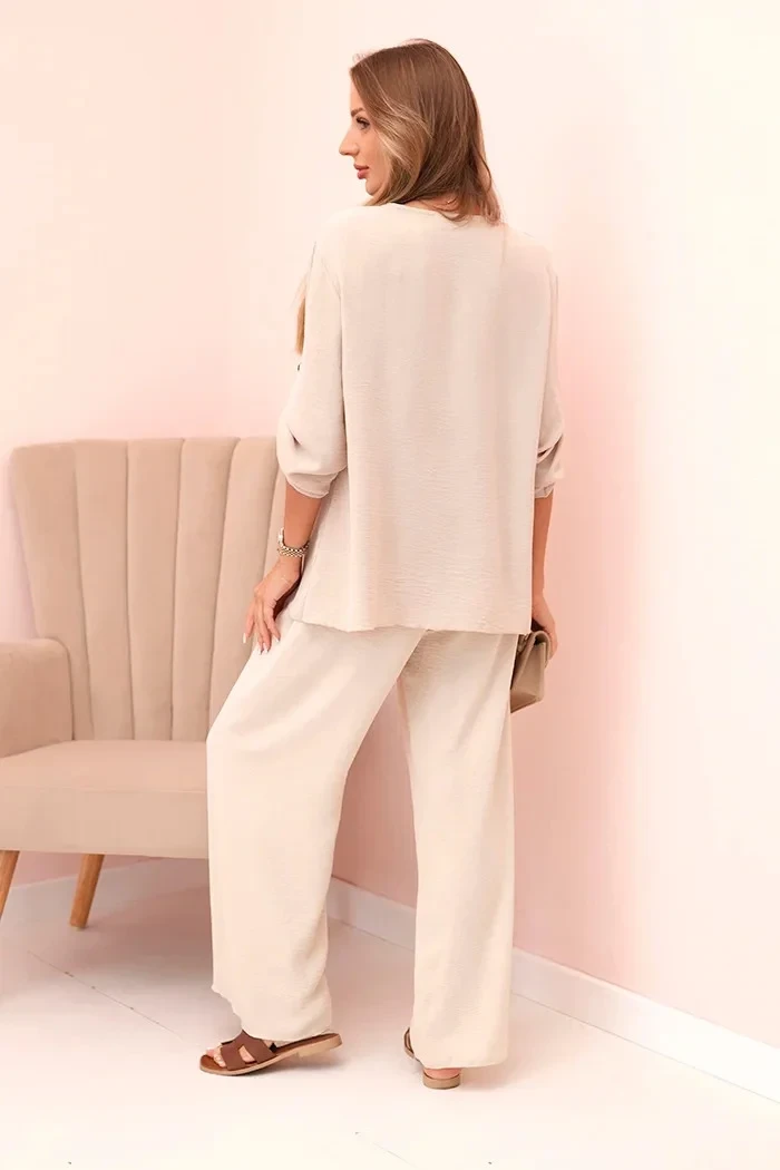 Dámský komplet s halenkou s náhrdelníkem a širokými nohavicemi béžový