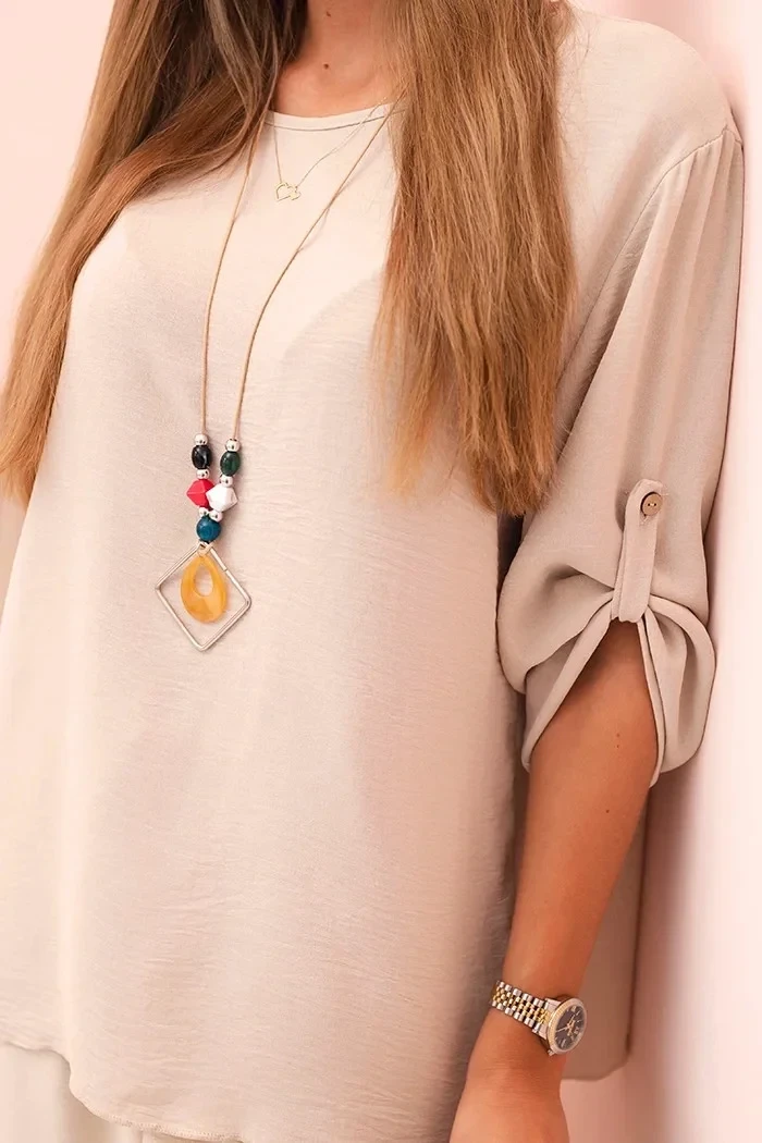 Tato stylová dámská souprava je skvělou volbou pro ženy, které oceňují pohodlí a eleganci v každodenním stylu. Souprava obsahuje volnou halenku s 3/4 rukávy, které lze upravit pomocí knoflíku, a široké kalhoty s gumou a šňůrkou v pase, které zajišťují volnost pohybu a skvělé přizpůsobení postavě. Celek doplňuje originální náhrdelník, který dodává stylizaci charakter a výjimečný akcent. Souprava je ideální jak na běžné nošení, tak i na společenská setkání, procházky nebo volnější dny v práci. Díky univerzálnímu střihu a neutrálním barvám ji snadno sladíte s oblíbenými doplňky a obuví. Velikost je univerzální a bude vhodná pro ženy velikostí S, M nebo L.