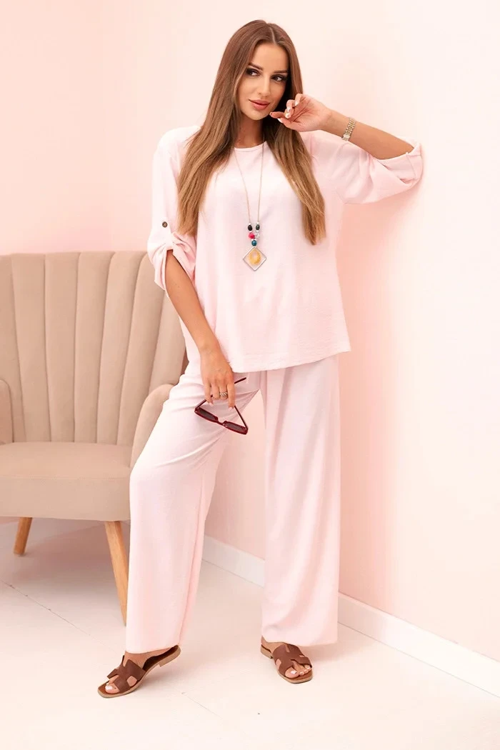 Dámský komplet s halenkou s náhrdelníkem a širokými nohavicemi pudrově růžová