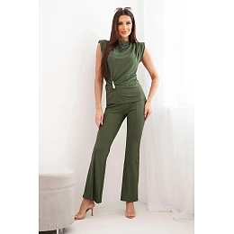 Dámský komplet s nařasením halenky a širokými kalhotami khaki