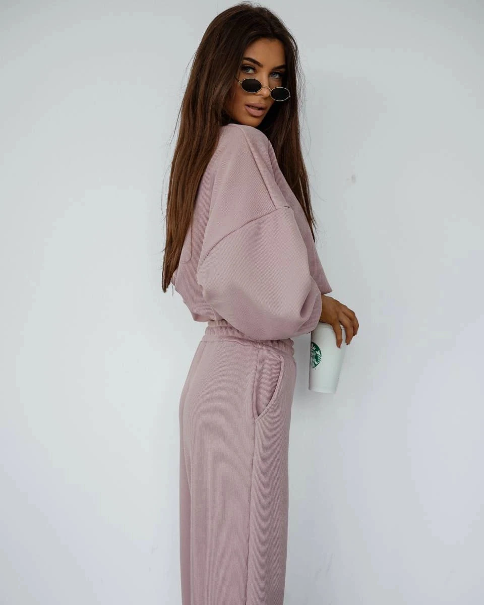 Dámský komplet s vaflovou strukturou v pudrově růžové barvě - mikina a kalhoty (821108)