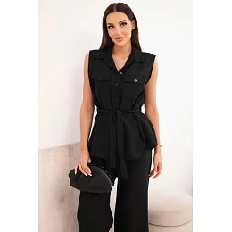 Stylový dámský komplet je vynikající nabídkou pro ženy, které si cení pohodlí, módního vzhledu a univerzálních řešení v každodenních stylizacích. Model se skládá z halenky bez rukávů zapínané na knoflíky a z dlouhých kalhot se širokými nohavicemi, díky čemuž celek působí lehce, ženskě a velmi moderně. Dalším plusem halenky je klasický límec, náprsní kapsy a pásek k zavazování v pase, který krásně zvýrazní postavu. Kalhoty mají pohodlnou gumu v pase, což zajišťuje komfort nošení a dobré přizpůsobení postavě.