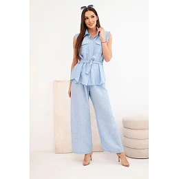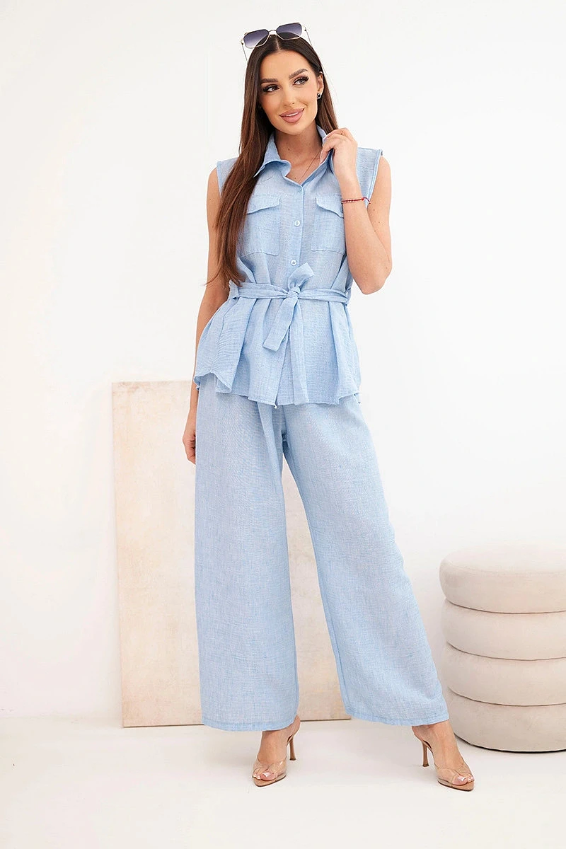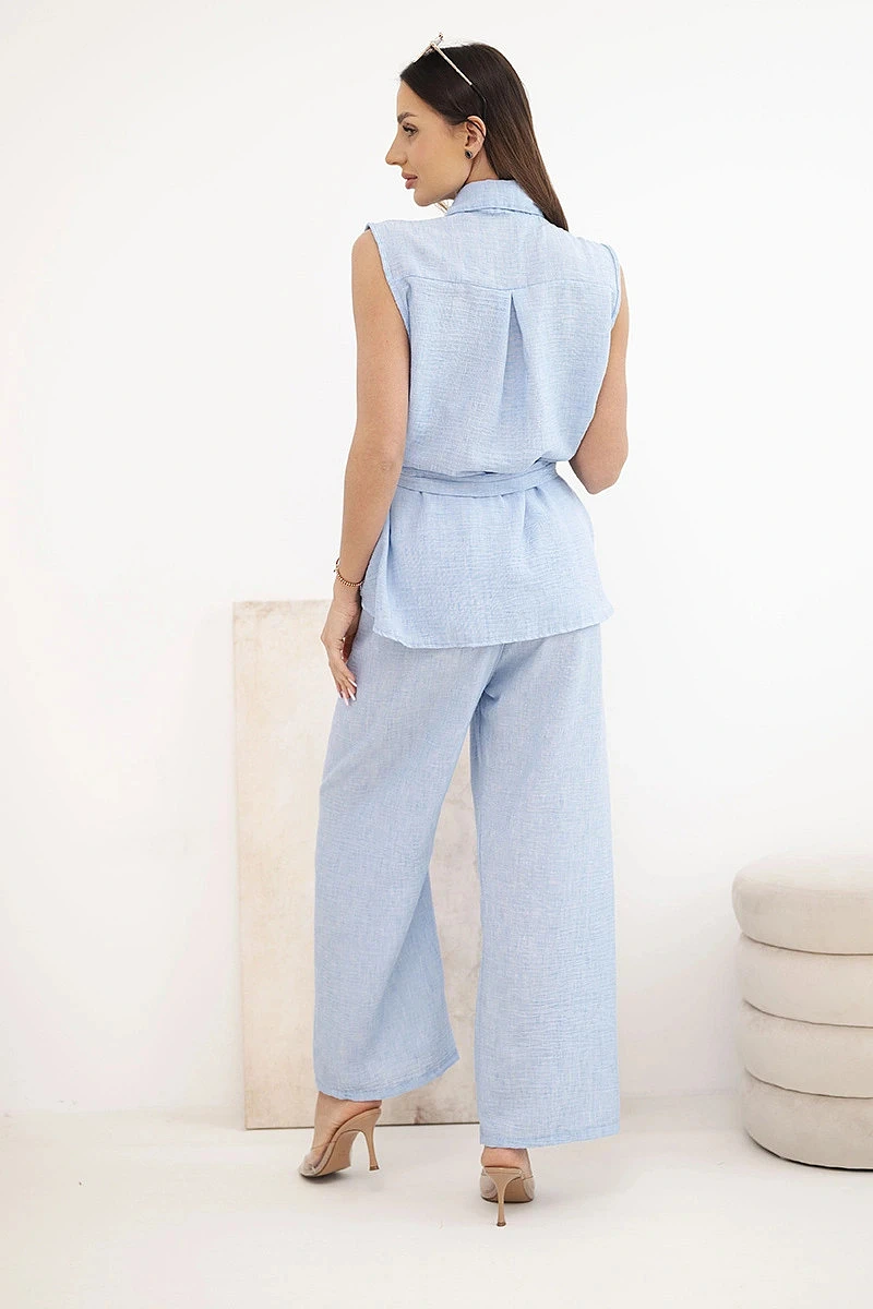Stylový dámský komplet je vynikající nabídkou pro ženy, které si cení pohodlí, módního vzhledu a univerzálních řešení v každodenních stylizacích. Model se skládá z halenky bez rukávů zapínané na knoflíky a z dlouhých kalhot se širokými nohavicemi, díky čemuž celek působí lehce, ženskě a velmi moderně. Dalším plusem halenky je klasický límec, náprsní kapsy a pásek k zavazování v pase, který krásně zvýrazní postavu. Kalhoty mají pohodlnou gumu v pase, což zajišťuje komfort nošení a dobré přizpůsobení postavě.