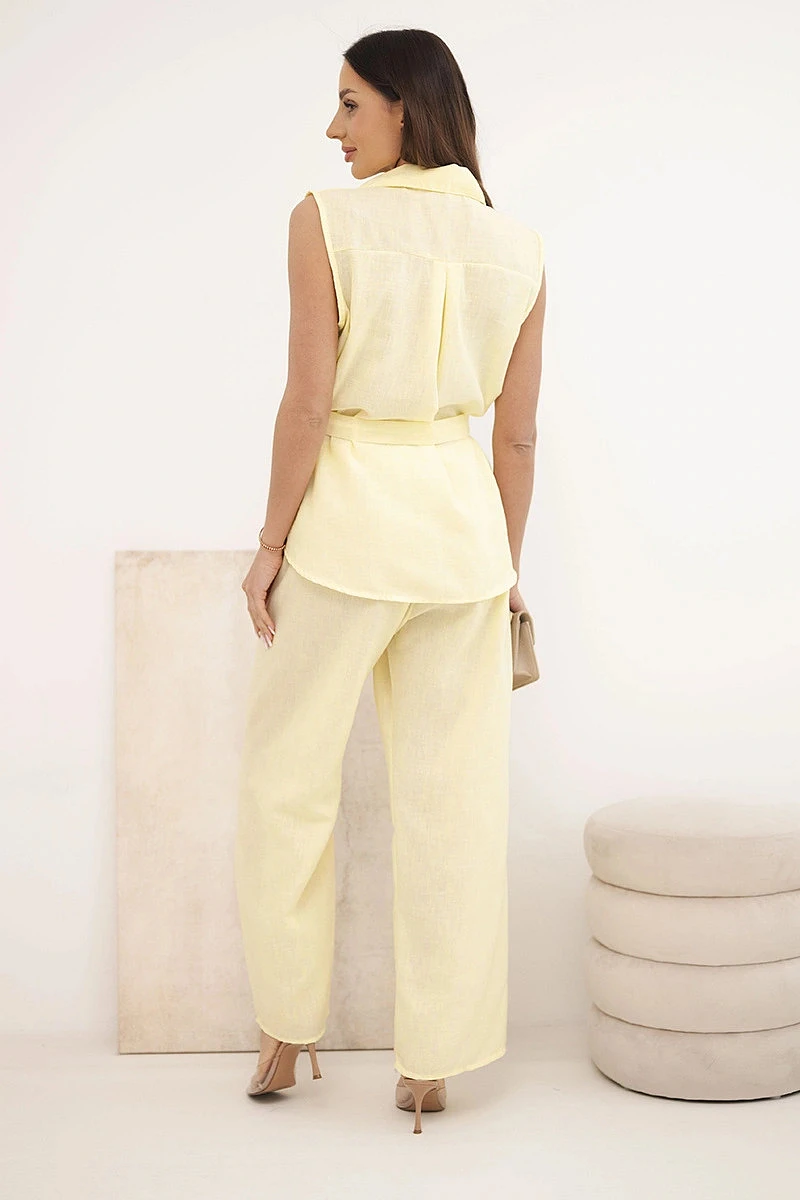 Stylový dámský komplet je vynikající nabídkou pro ženy, které si cení pohodlí, módního vzhledu a univerzálních řešení v každodenních stylizacích. Model se skládá z halenky bez rukávů zapínané na knoflíky a z dlouhých kalhot se širokými nohavicemi, díky čemuž celek působí lehce, ženskě a velmi moderně. Dalším plusem halenky je klasický límec, náprsní kapsy a pásek k zavazování v pase, který krásně zvýrazní postavu. Kalhoty mají pohodlnou gumu v pase, což zajišťuje komfort nošení a dobré přizpůsobení postavě.