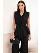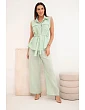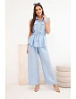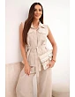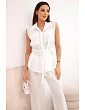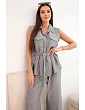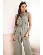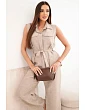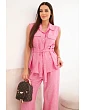 Stylový dámský komplet je vynikající nabídkou pro ženy, které si cení pohodlí, módního vzhledu a univerzálních řešení v každodenních stylizacích. Model se skládá z halenky bez rukávů zapínané na knoflíky a z dlouhých kalhot se širokými nohavicemi, díky čemuž celek působí lehce, ženskě a velmi moderně. Dalším plusem halenky je klasický límec, náprsní kapsy a pásek k zavazování v pase, který krásně zvýrazní postavu. Kalhoty mají pohodlnou gumu v pase, což zajišťuje komfort nošení a dobré přizpůsobení postavě.