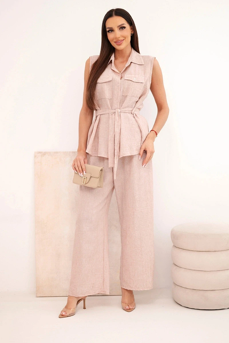 Stylový dámský komplet je vynikající nabídkou pro ženy, které si cení pohodlí, módního vzhledu a univerzálních řešení v každodenních stylizacích. Model se skládá z halenky bez rukávů zapínané na knoflíky a z dlouhých kalhot se širokými nohavicemi, díky čemuž celek působí lehce, ženskě a velmi moderně. Dalším plusem halenky je klasický límec, náprsní kapsy a pásek k zavazování v pase, který krásně zvýrazní postavu. Kalhoty mají pohodlnou gumu v pase, což zajišťuje komfort nošení a dobré přizpůsobení postavě.
