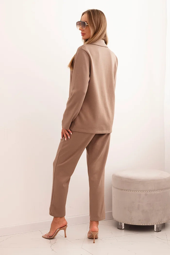 Elegantní dámský komplet s viskózou je ideální kombinací klasiky a modernosti. Sako s jednoduchým střihem a ozdobným motivem z kamínků na prsou dodává stylizaci jedinečný charakter, a pohodlné kalhoty s elastickým pasem a jemnou dekorací tvoří soudržný a stylový celek. To je vynikající souprava na mnoho příležitostí – do práce, na schůzky či na každodenní vycházky.