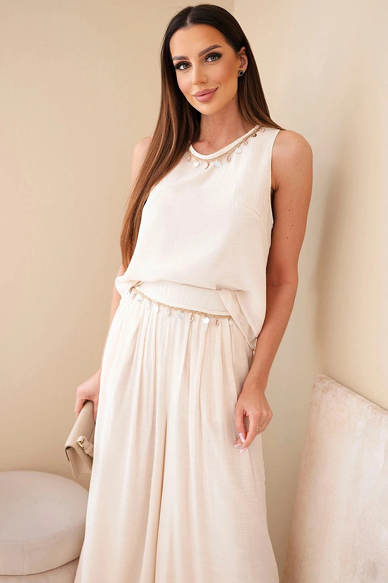 Dámský komplet s viskózou, top bez rukávů a kalhoty se širokou nohavicí a ozdobným zakončením béžový