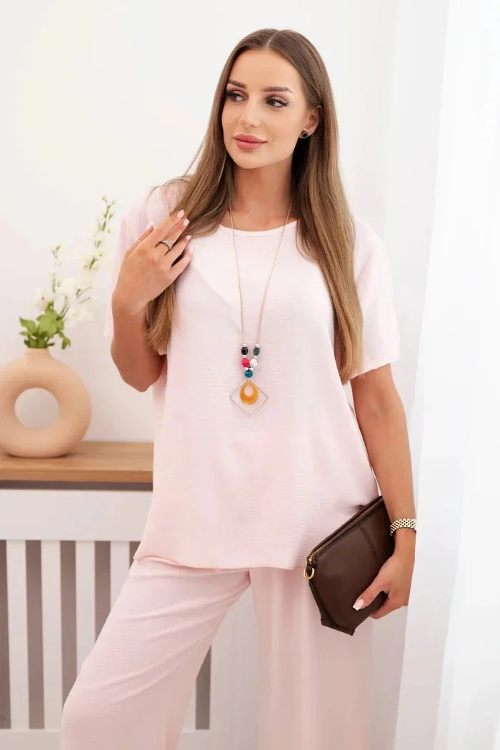 Dámský komplet s volnou halenkou a širokými nohavicemi pudrově růžová